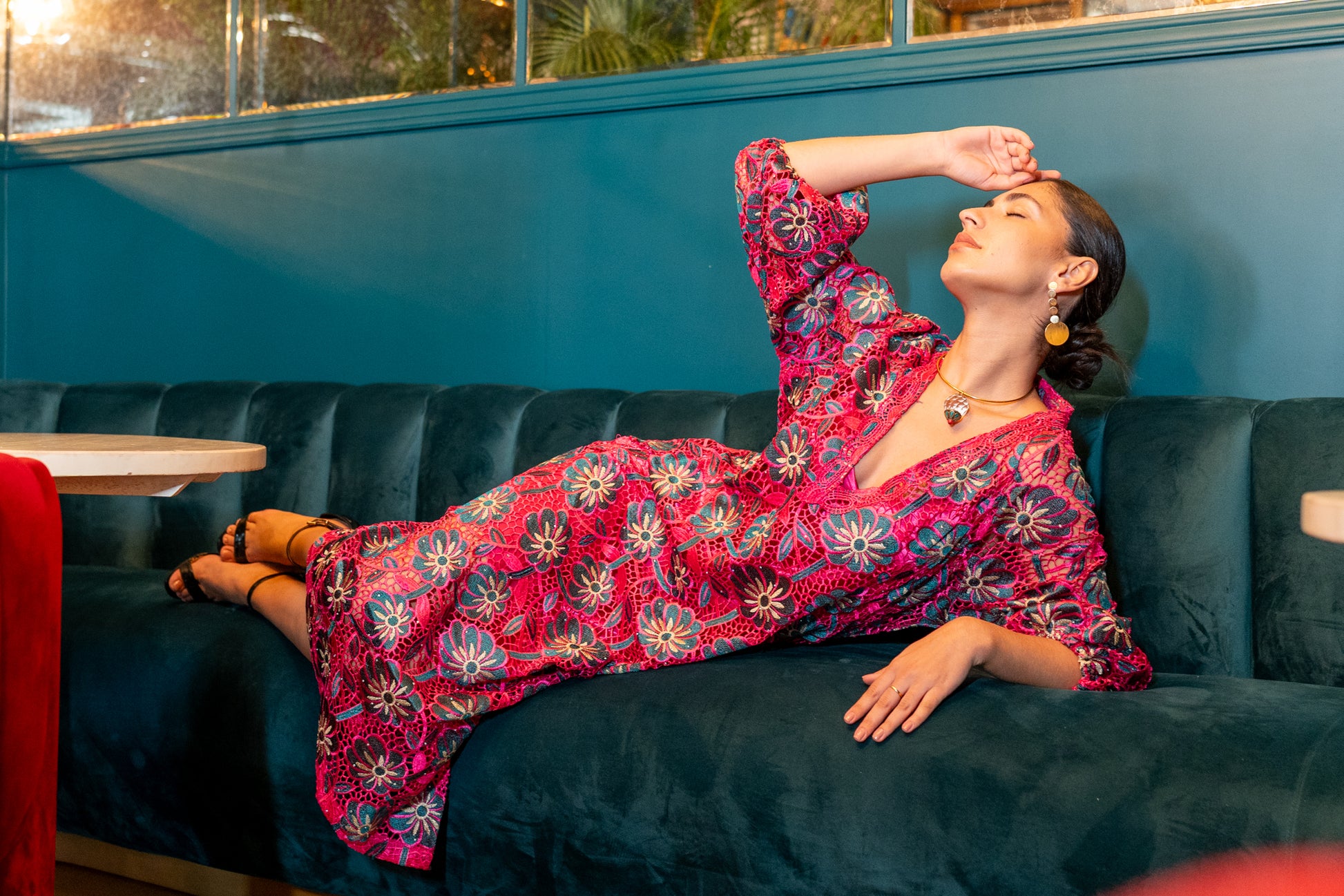 Inspirado en Jackie Kennedy, la definición de la elegancia atemporal. El Vestido Jackie es una pieza estructurada con un diseño impecable, realzado por su encaje floral y su color vibrante. Un clásico reinventado para mujeres que entienden que el verdadero poder está en la sutileza.